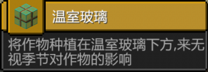 制造温室玻璃以克服季节的阻碍种植作物.温室玻璃正下方7格范围内的作物会无视季节生长.